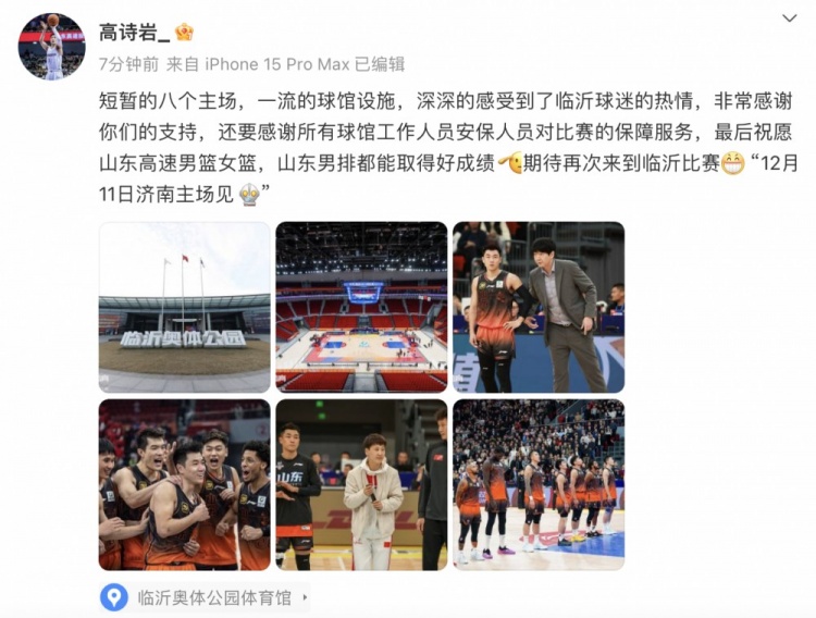 赛后,山东球员高诗岩更博写道:“短暂的八个主场,一流的球馆设施,深深的感受到了临沂球迷的热情,非常感谢你们的支持,还要感谢所有球馆工作人员安保人员对比赛的保障服务,最后祝愿山东高速男篮女篮,山东男排都能取得好成绩,期待再次来到临沂比赛。12月11日济南主场见。”